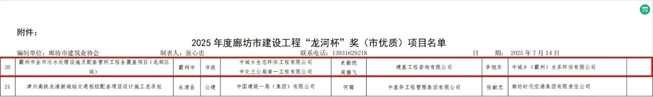 近日,河北省廊坊市建筑業(yè)協(xié)會公示了《關(guān)于公布2025年度廊坊市建設(shè)工程“龍河杯”獎(市優(yōu)質(zhì))工程項目名單的通知》,公司監(jiān)理的霸州市全市污水處理設(shè)施及配套管網(wǎng)工程全覆蓋項目(北部區(qū)域),憑借高標(biāo)準(zhǔn)的質(zhì)量管控體系與創(chuàng)新實踐的管理模式成功入選,榮膺廊坊市優(yōu)質(zhì)工程“龍河杯”獎。