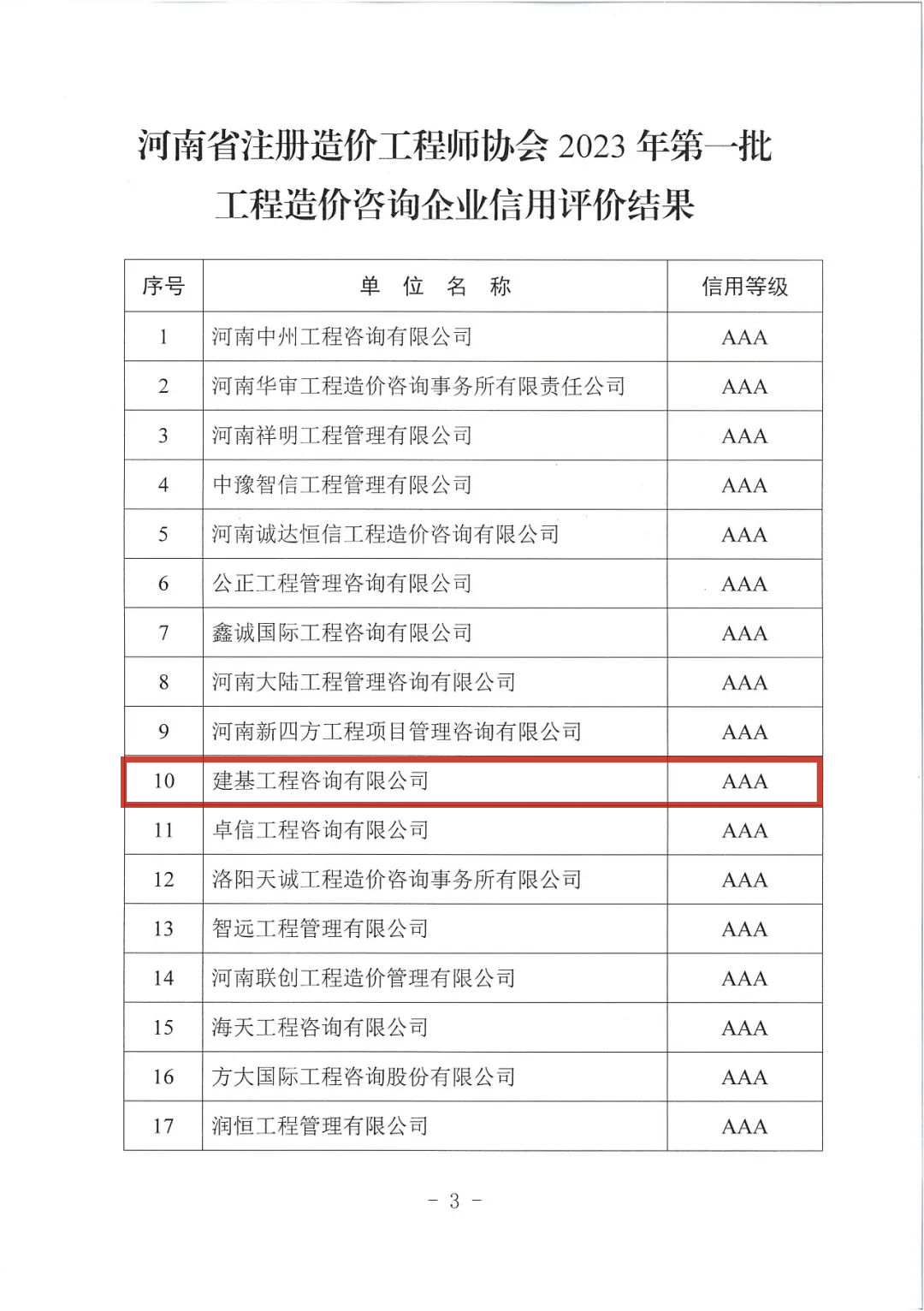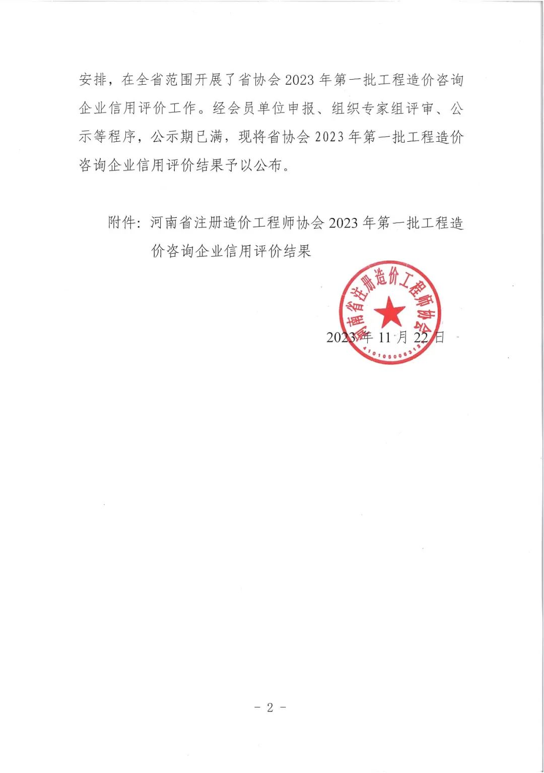 近日,河南省注冊造價工程師協會公布《關于對河南省注冊造價工程師協會2023年第一批工程造價咨詢企業信用評價結果公示的通知》,公司獲評“河南省注冊造價工程師協會2023年第一批工程造價咨詢企業信用評價AAA等級”,這一成績充分表明了公司在工程造價咨詢領域中的卓越實力,并進一步樹立了企業良好的聲譽。